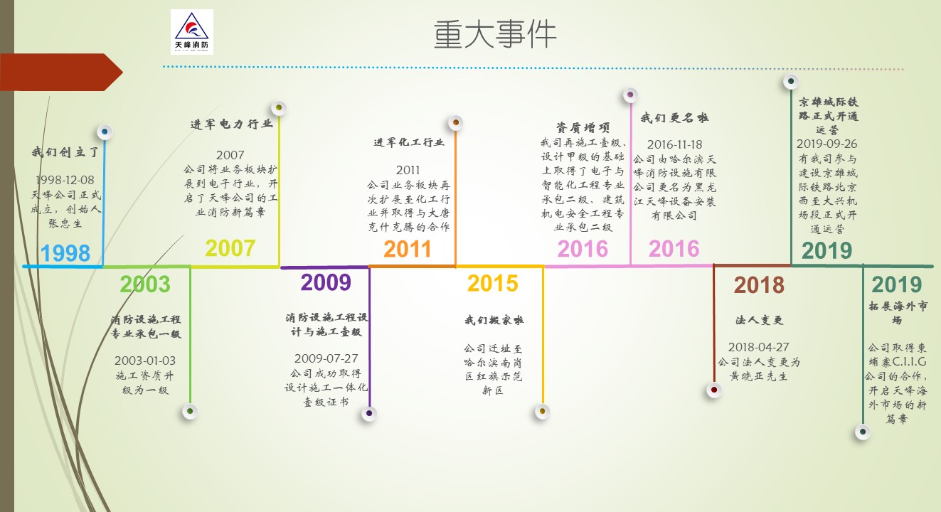 黑龍江天峰設(shè)備安裝有限公司(以下簡稱:天峰消防)創(chuàng)立于1998年,主要承接能源化工、石化、電力、軌道交通、冶金、城市管廊等工業(yè)行業(yè)消防系統(tǒng)工程,可為客戶提供特殊消防系統(tǒng)的詳細設(shè)計、供貨、施工等集成服務(wù),天峰消防將依靠自身實力和信譽實現(xiàn)“立足龍江,布局全國,走向海外”的目標(biāo)。